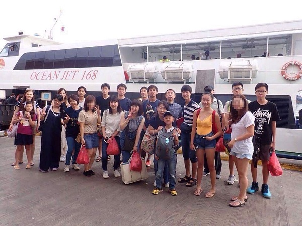 船の前でも集合写真をバッチリ決め、一行はフェリーに乗り込みます。