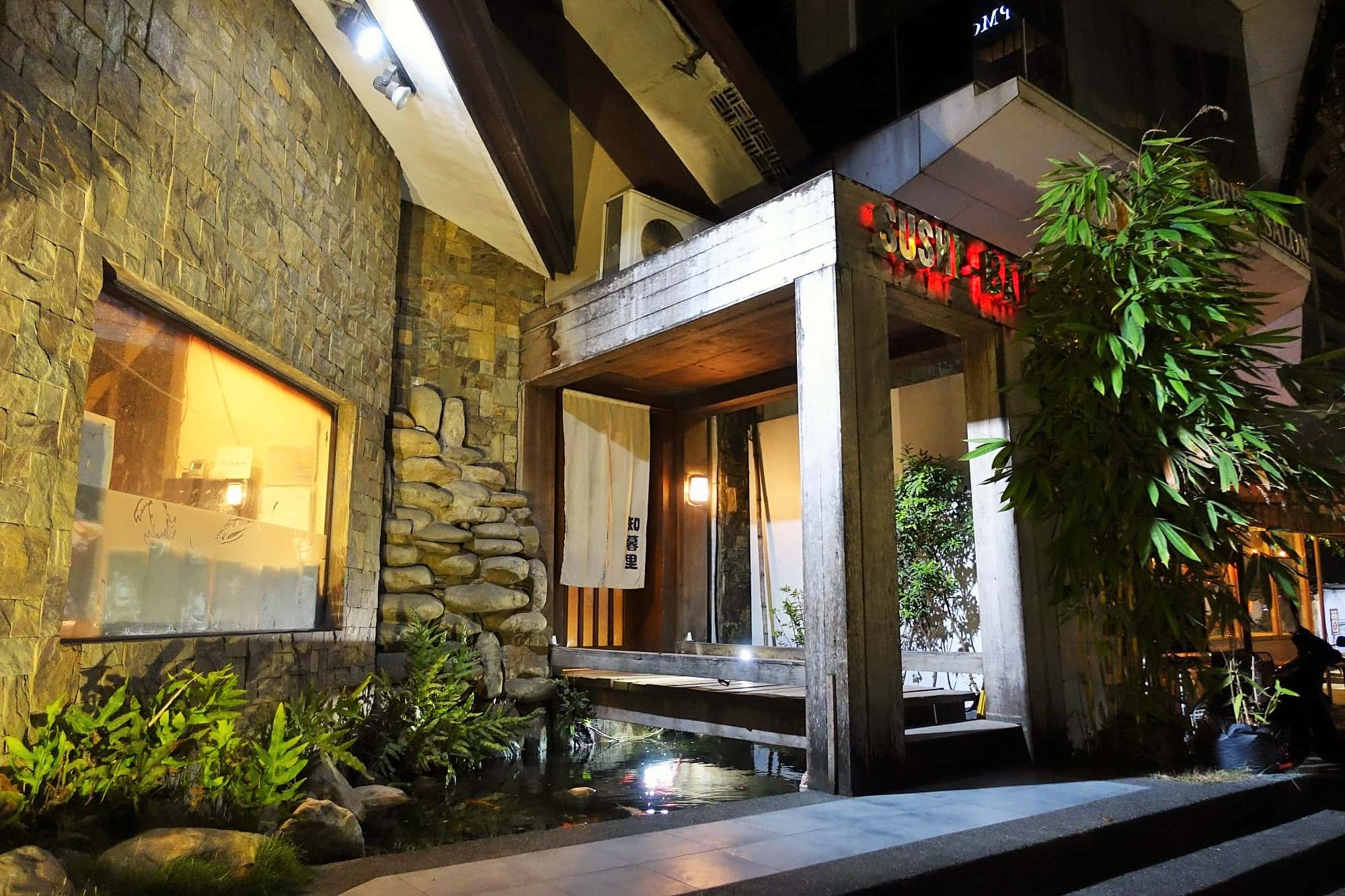 「Sushi Bar」と掲げてある右側の入口にある池では、鯉が優雅に客人を迎えてくれます。