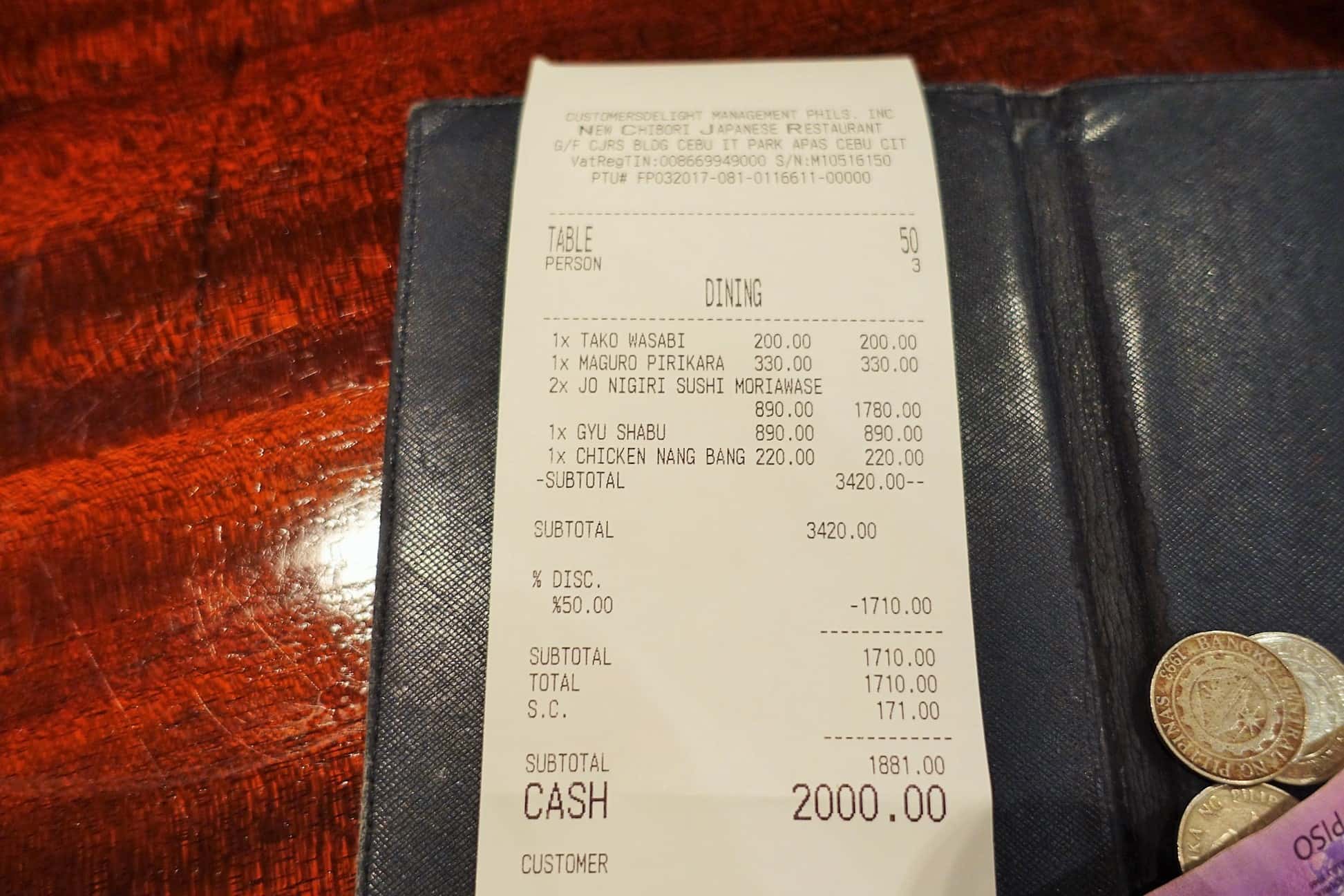 半額になってから消費税が加算され、支払い金額は1,881ペソなり!