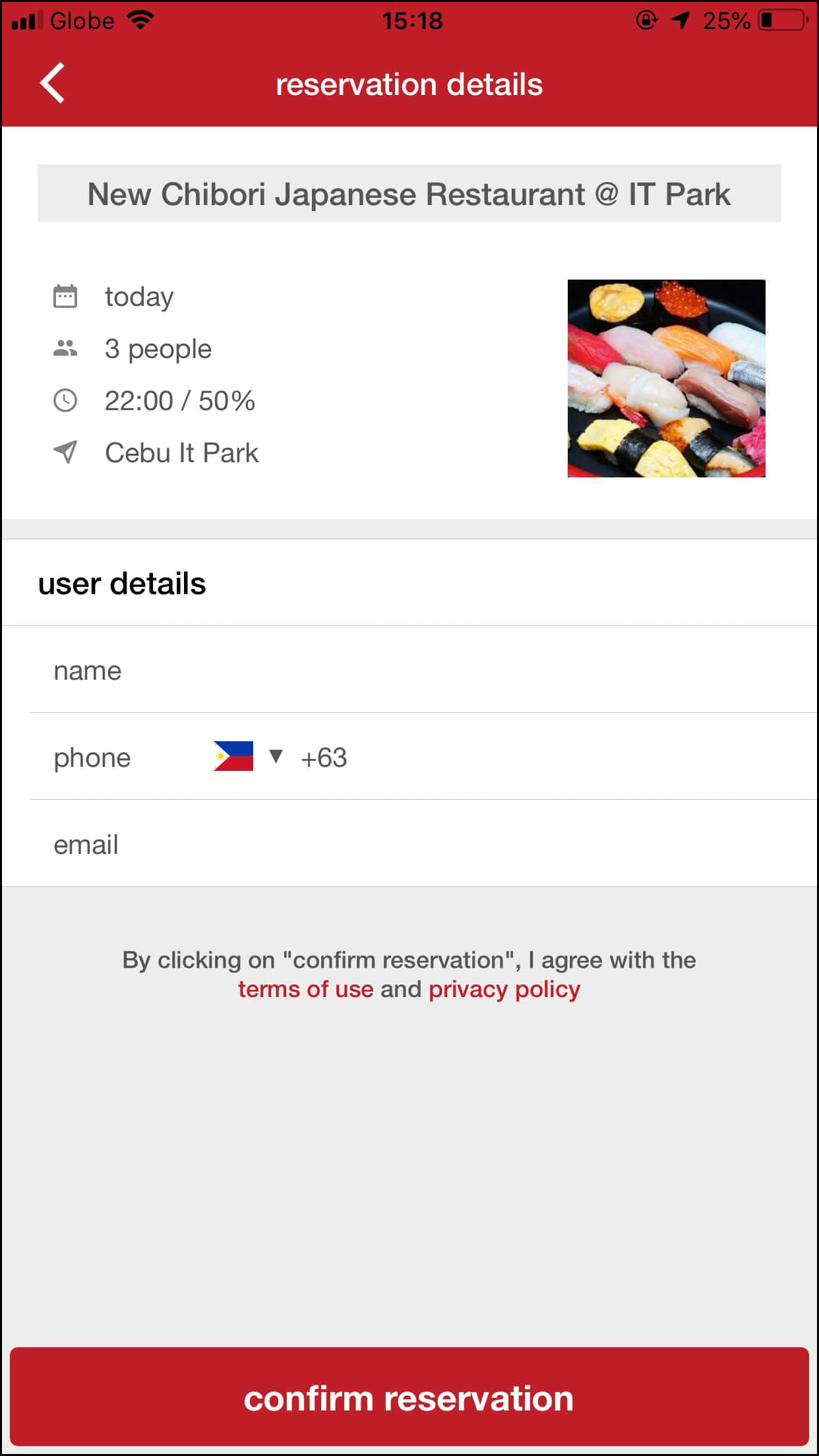 行きたいレストランが決まったら、予約画面へと進みます。
