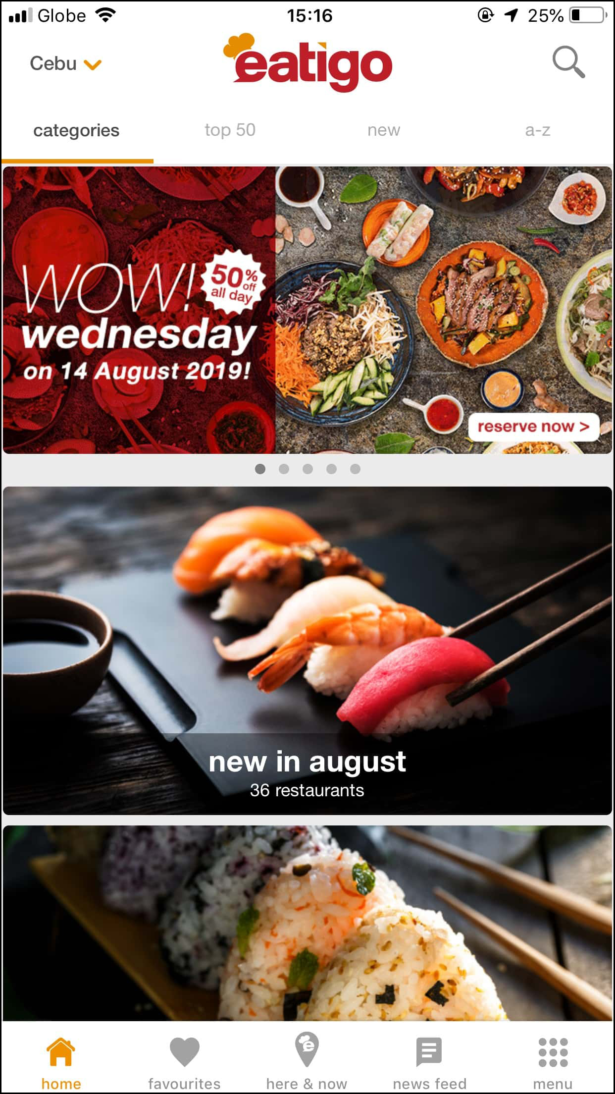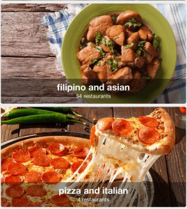 新規登録店、人気店、ステーキ、ビュッフェ、和食、フィリピン料理、ピザ、カフェ等、ジャンルからお店を絞り込むことができます。