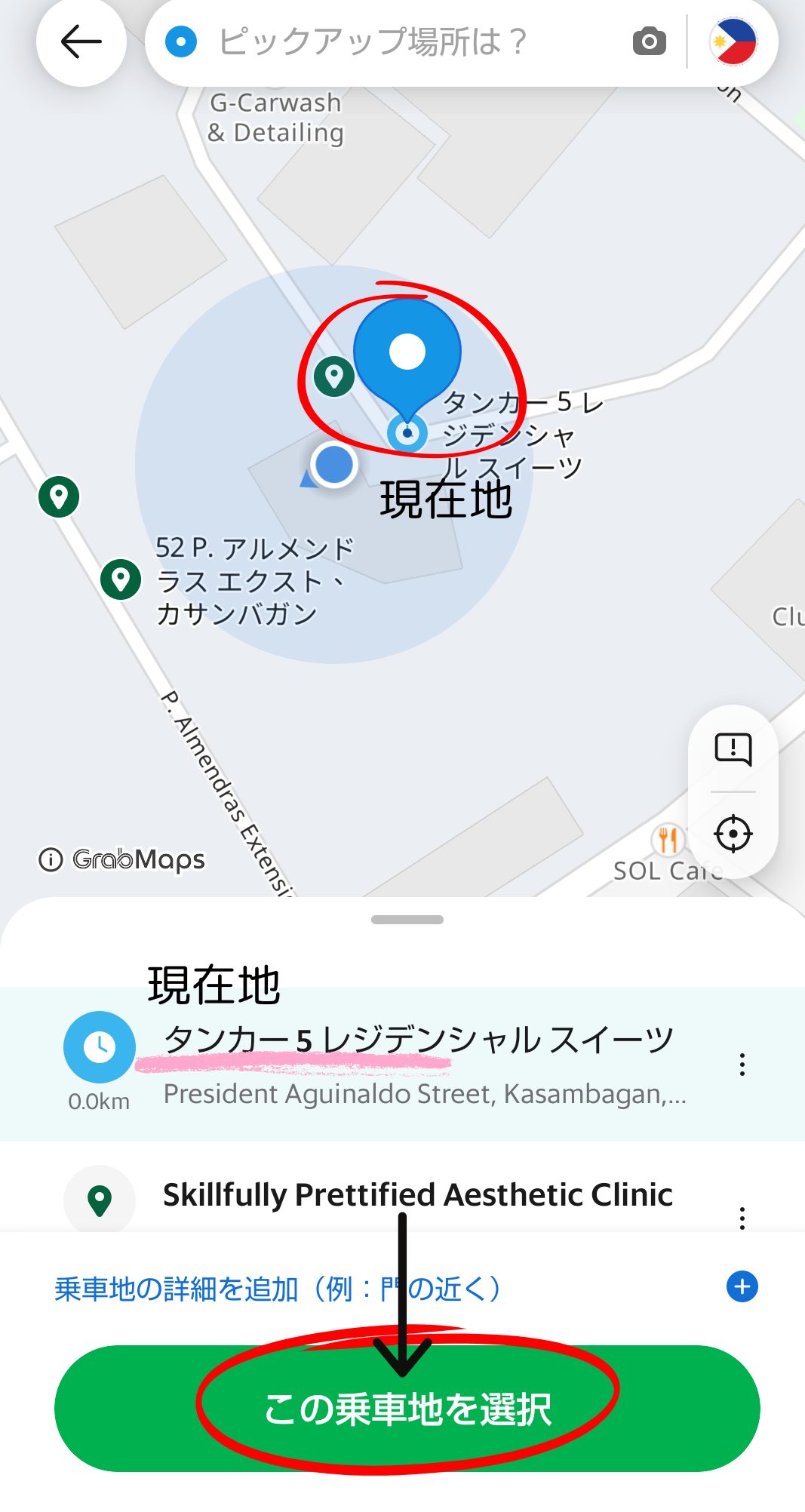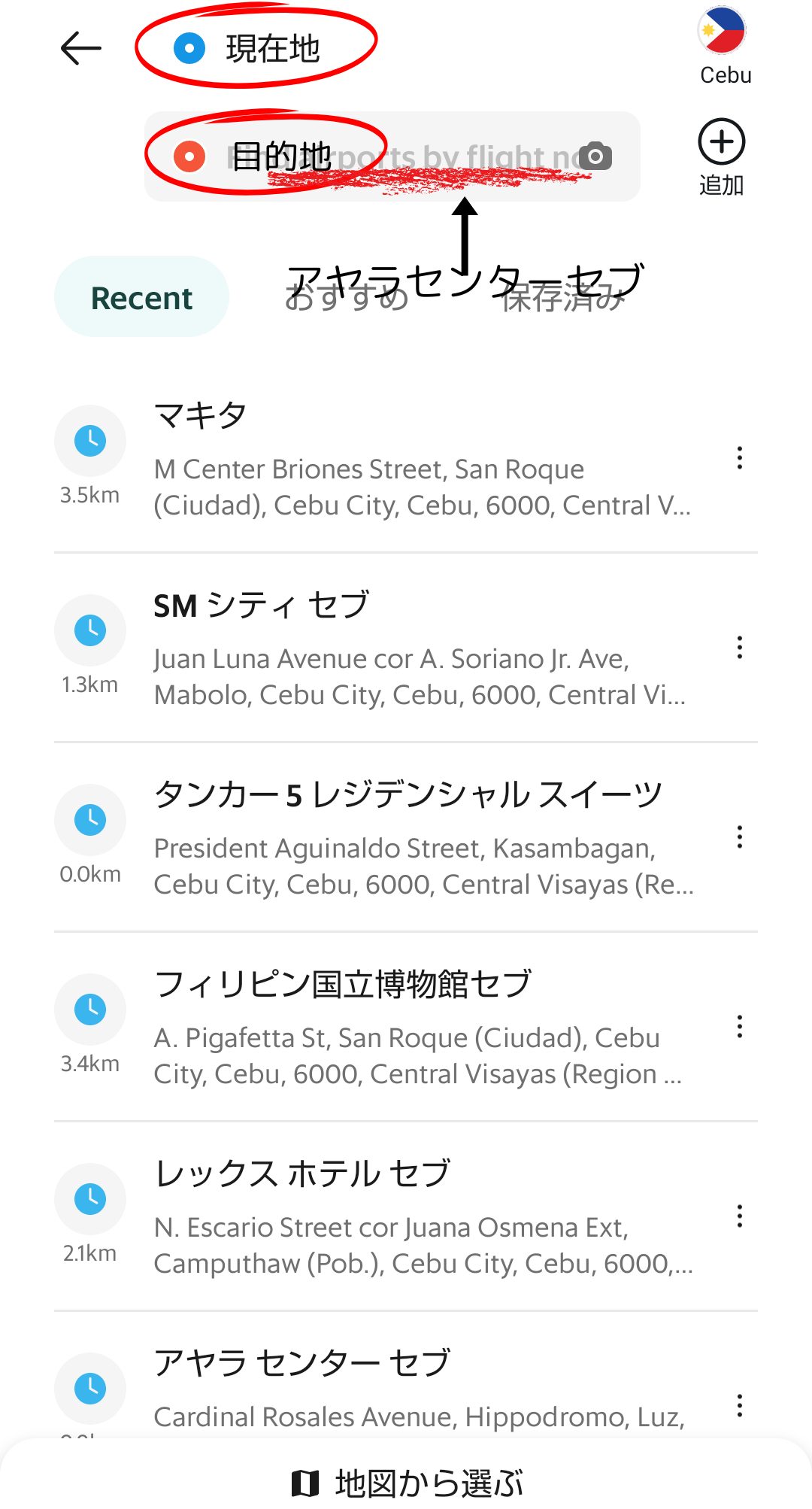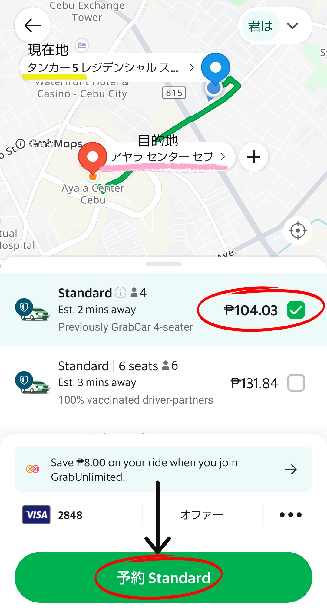 3.上記の画面に、ピックアップ地点(現在地) と 目的地 を入力。今回は「アヤラ センターセブ」を目的地として、入力します。その後下記の画面が出てきます。