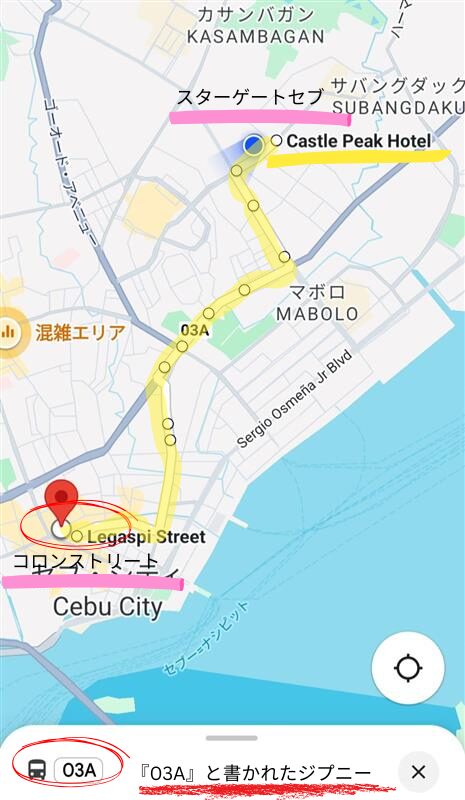 今回は「03A」と書かれたジプニーに乗り、コロンストリートに向かいました。時間帯によって多少前後しますが、40分くらいかかりました。また、留学生や長期滞在者がジプニーを利用する場合、目的地はだいたい決まっていると思いますので、利用するジプニーの路線番号を覚えておくととても便利です。こちらのブログでは、ジプニーの乗り方について紹介しています。ぜひ参考にしてみてください!!