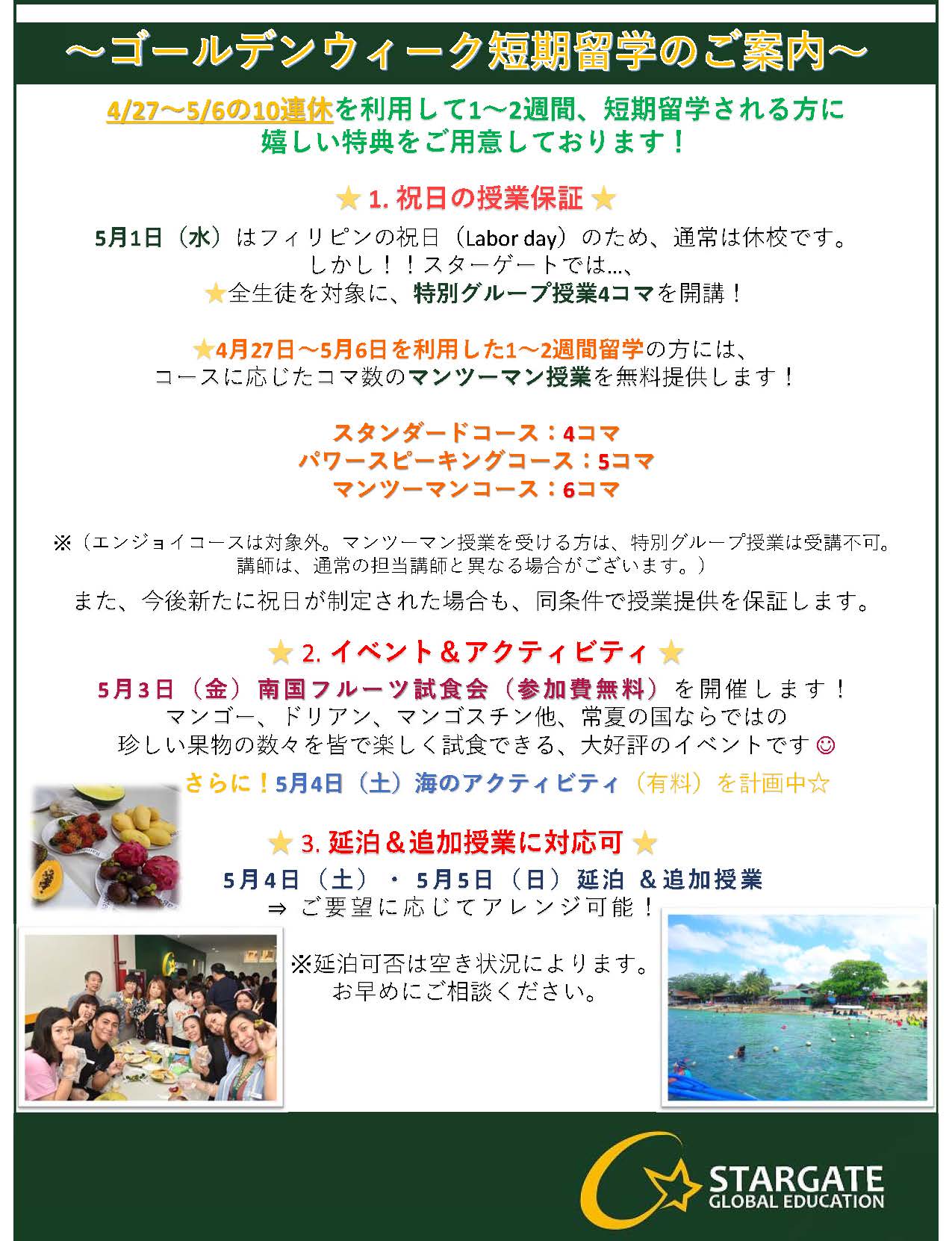 1週間の短期留学の生徒さんも多く、活気にあふれるセブ島でのゴールデンウィーク。
