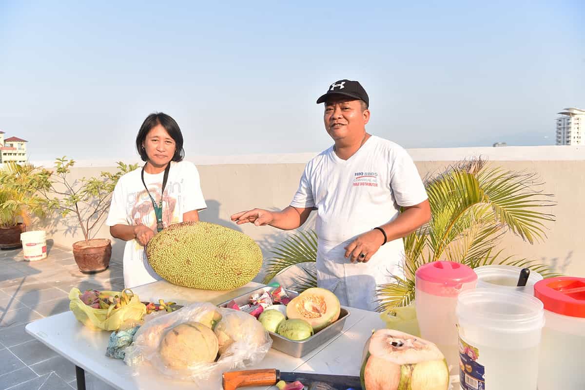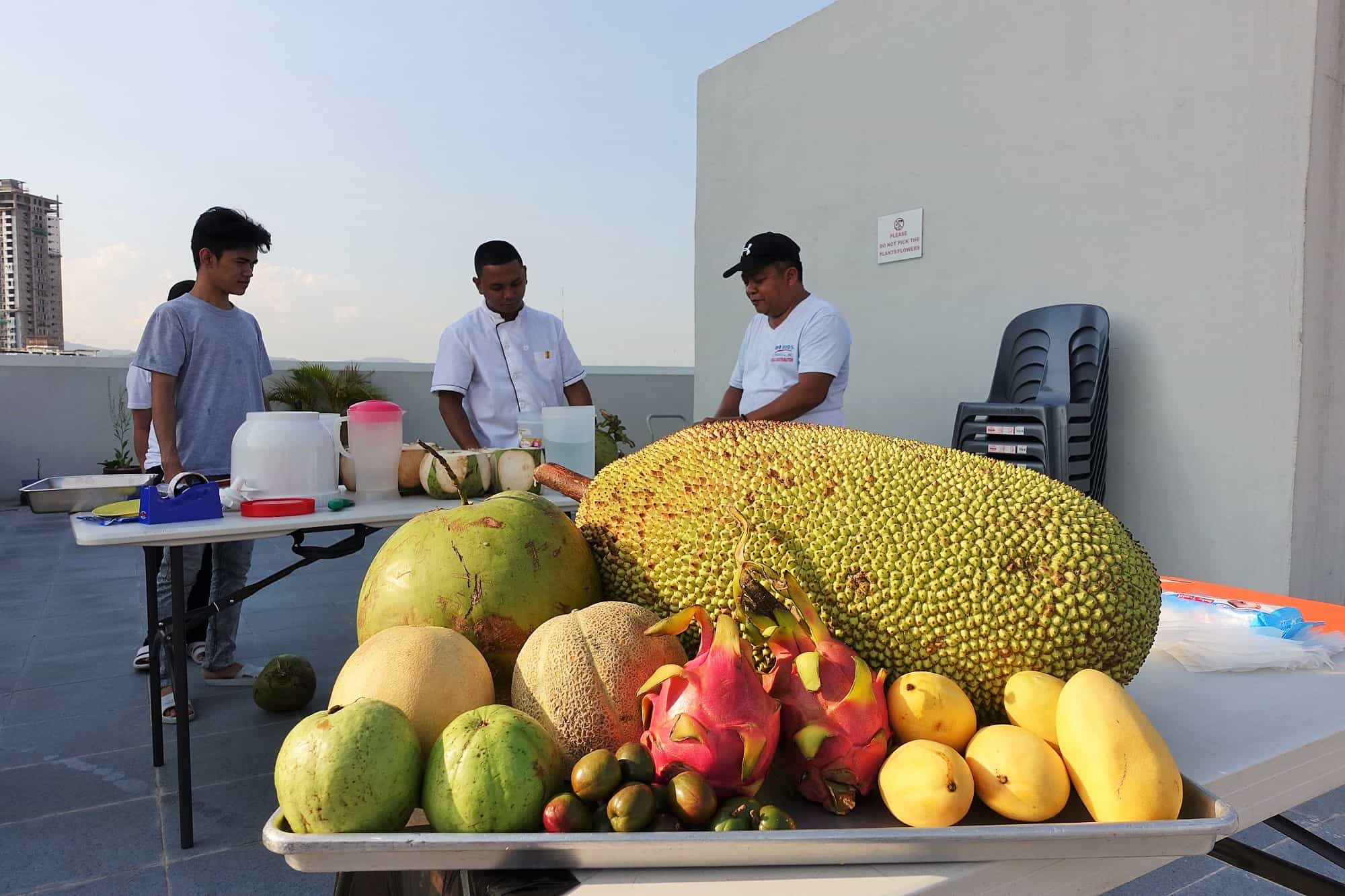 ココナッツや、ジャックフルーツなど包丁では対応できないものはナタをふるって切り分けたり見栄えが良いフルーツカットなど、創意工夫を凝らして生徒さんの到着を待ちます。