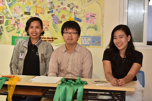 右からフィリピン人事務職員のおしゃれ番長クレアさん、セブ滞在歴6年目、現在子育て奮闘中日本人マネーシャーの石村さん、そして我らがStargate校のアカデミックヘッド、JJ先生になります。