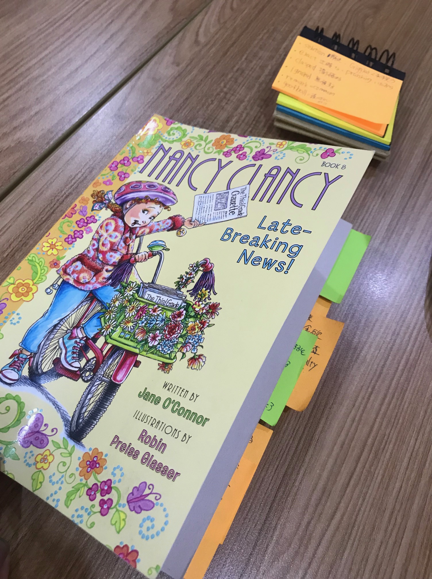 いくら簡単、子供向けの本だと言っても、もちろんわからない単語がでてくるので付箋を貼って工夫していました。