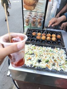 タコなしのたこ焼き(これは果たしてたこ焼きなのなのでしょうか。。)を食べてみたら、甘いソースか辛いソースで選ぶことができました。オタフクソースが恋しいですね、、、