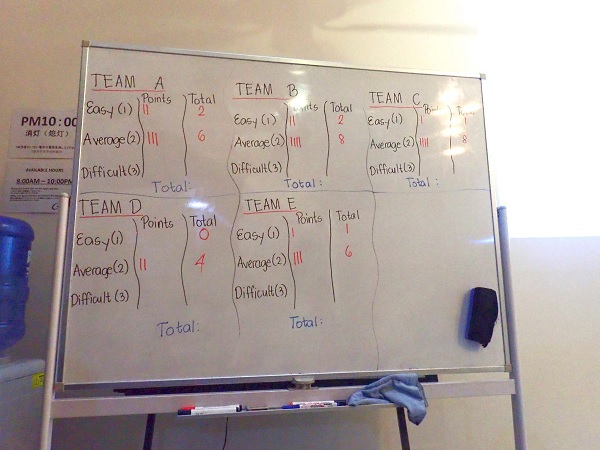 今回は沢山の生徒さんに参加していただき、5人で1チーム、計5チームで競い合いました。
