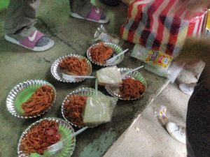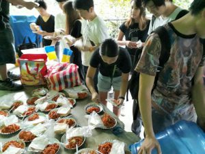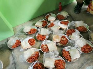 わたしたちで、スパゲッティと食パンをひとプレートにまとめて、お水はコップではなくビニール袋に入れていきます。