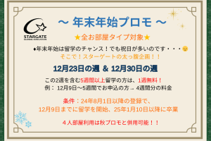 年末年始プロモ!全部屋対象、1週間留学費用無料キャンペーン!! 平素より当校スターゲートのホームページをご覧頂き誠にありがとうございます。 当校では、下記のお得なキャンペーンを実施します。 【留学キャ