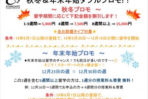 平素より当校スターゲートのホームページをご覧頂き誠にありがとうございます。 当校では、下記のお得なキャンペーンを実施します。 【秋冬プロモ 概要】 ☆プレミアム部屋を含む、全お部屋タイプが対象です。