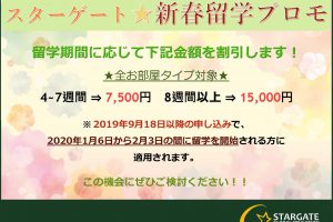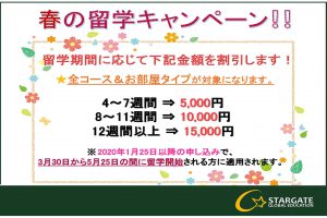 平素より当校スターゲートのホームページをご覧頂き誠にありがとうございます。 当校では、下記のお得なキャンペーンを実施します。 【春の留学キャンペーン 概要】 ☆プレミアム部屋を含む、全お部屋タイプが対
