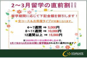 平素より当校スターゲートのホームページをご覧頂き誠にありがとうございます。 当校では、下記のお得なキャンペーンを実施します。 【春の直前!!留学留学キャンペーン 概要】 ☆プレミアム部屋を含む、全お部