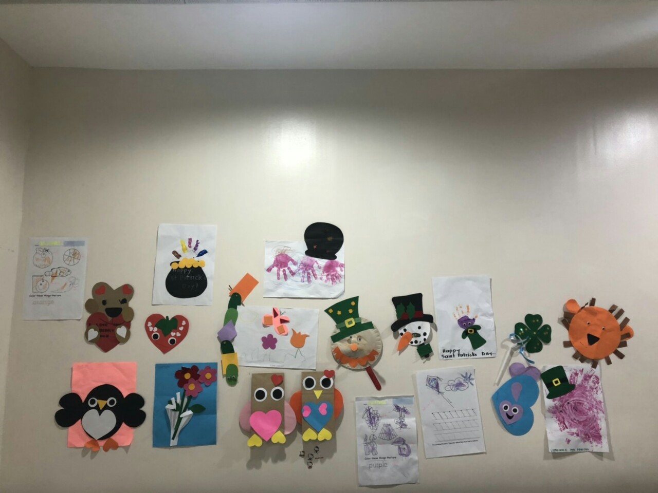 毎日かわいい作品を作って持って帰ってきてくれて、お部屋に貼りたがるので、壁いっぱいになりました。
